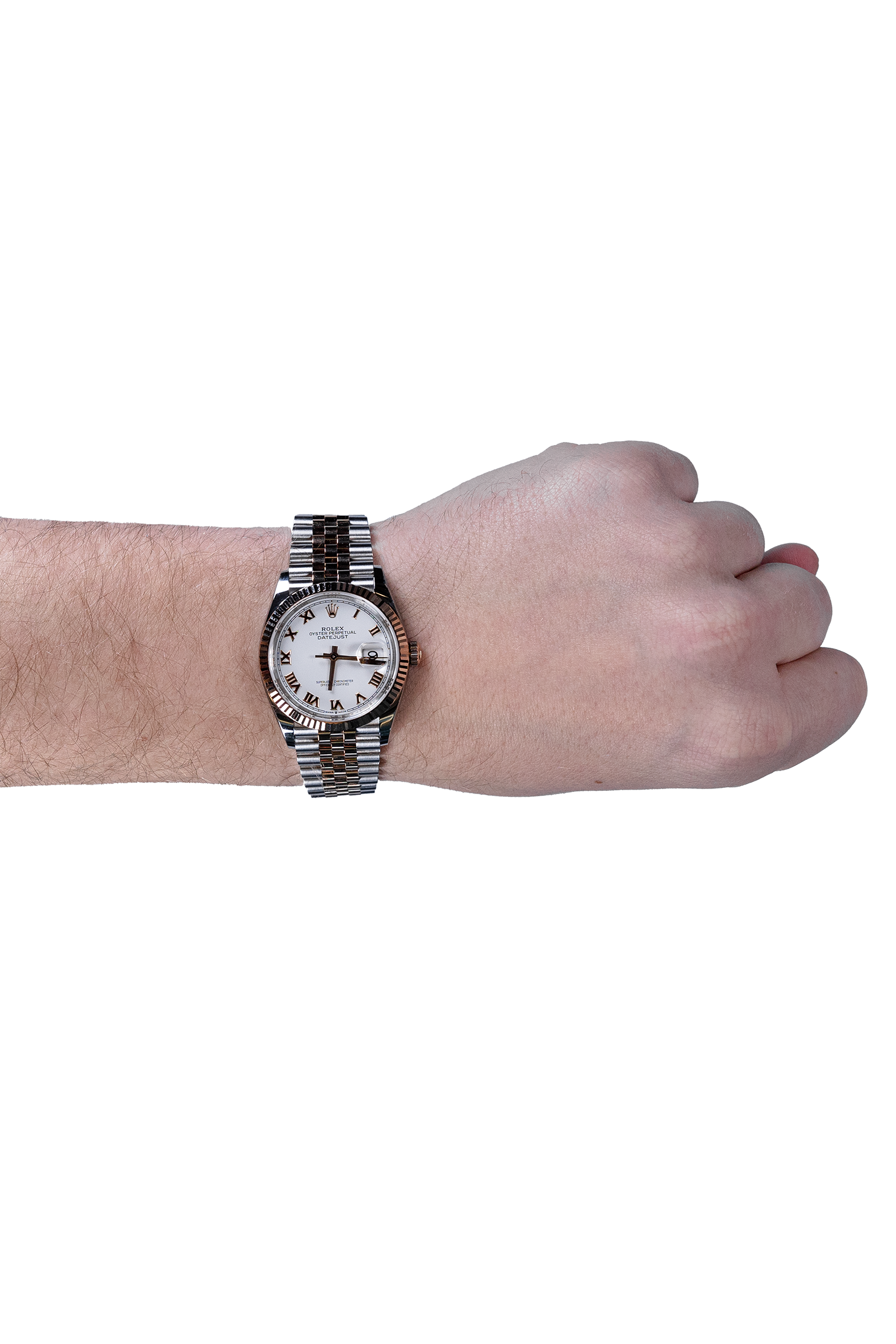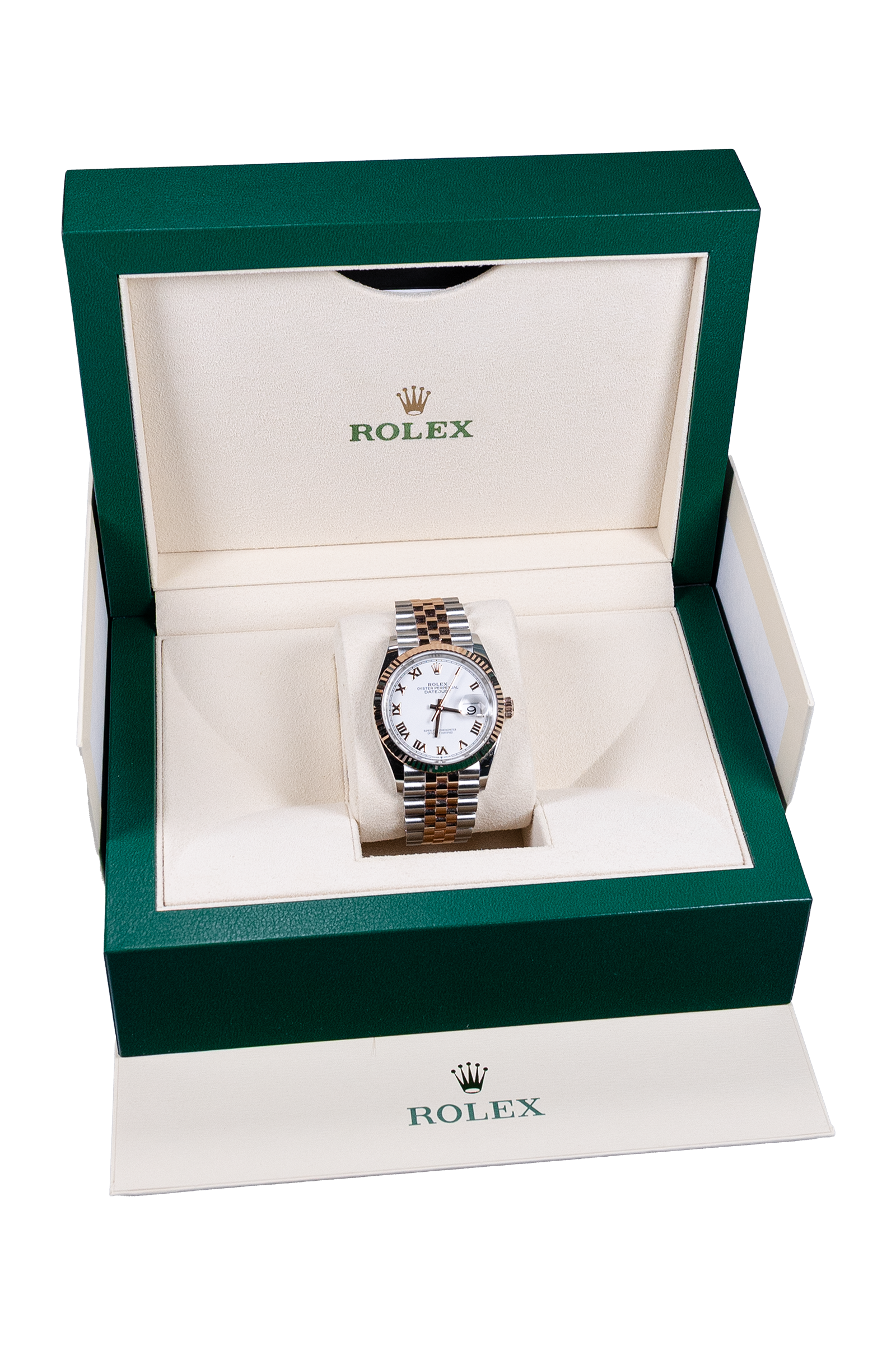 Diese Rolex Datejust 36 Ref. 126231 aus 2020 kombiniert Edelstahl und Roségold (Everose) zu einem eleganten, zeitlosen Look. Das weiße Zifferblatt mit klarer Gestaltung und das klassische Jubilee-Band unterstreichen die harmonische Ästhetik dieses Modells. Die Uhr weist leichte Gebrauchsspuren auf, befindet sich jedoch in sehr gutem Gesamtzustand und wird im kompletten Fullset, inklusive Box und Papieren, geliefert – ein stilvoller Allrounder für jeden Anlass.