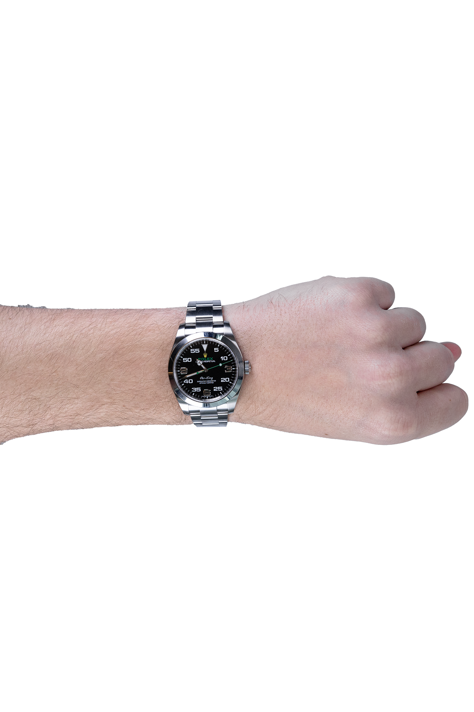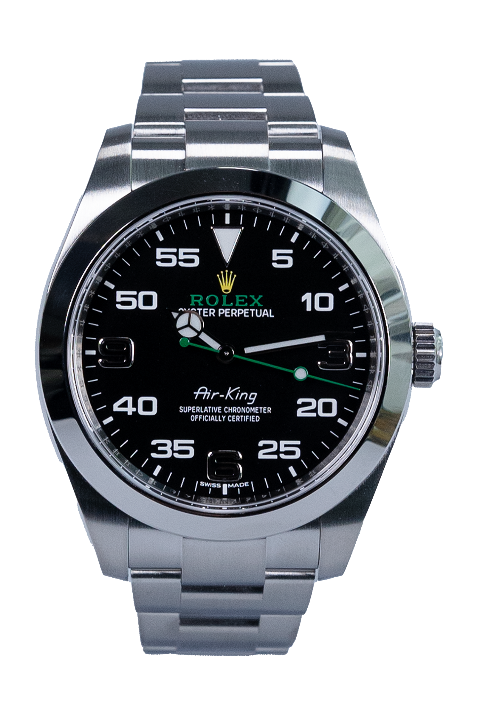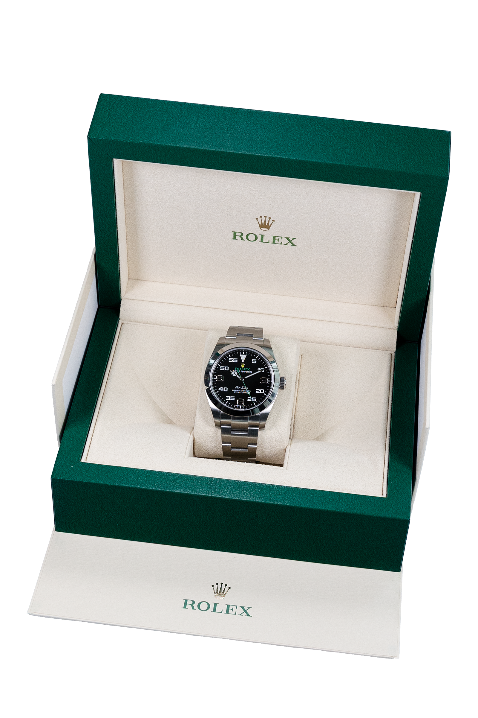 Diese Rolex Air-King 116900 aus 2020 präsentiert sich im klassischen 40 mm Edelstahlgehäuse und verbindet markantes Design mit klarer Ablesbarkeit. Das schwarze Zifferblatt mit den charakteristischen arabischen Ziffern und dem grünen Sekundenzeiger verleiht ihr einen unverwechselbaren Look. Die Uhr ist neu und ungetragen und kommt im kompletten Fullset – inklusive Originalbox und Papieren. Ein sportlicher Klassiker mit Tradition und Charakter.