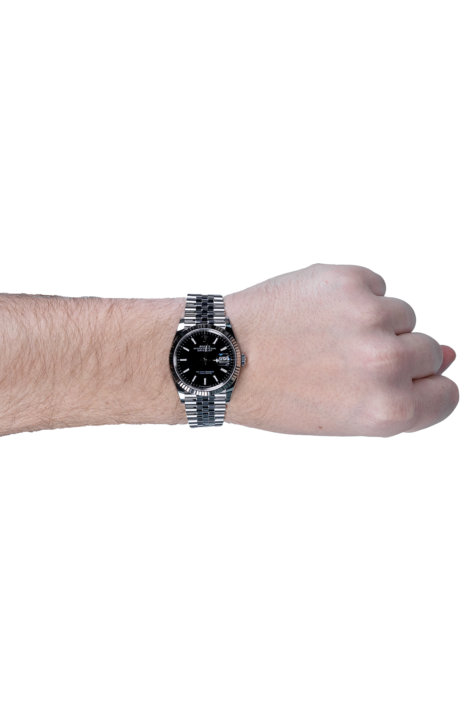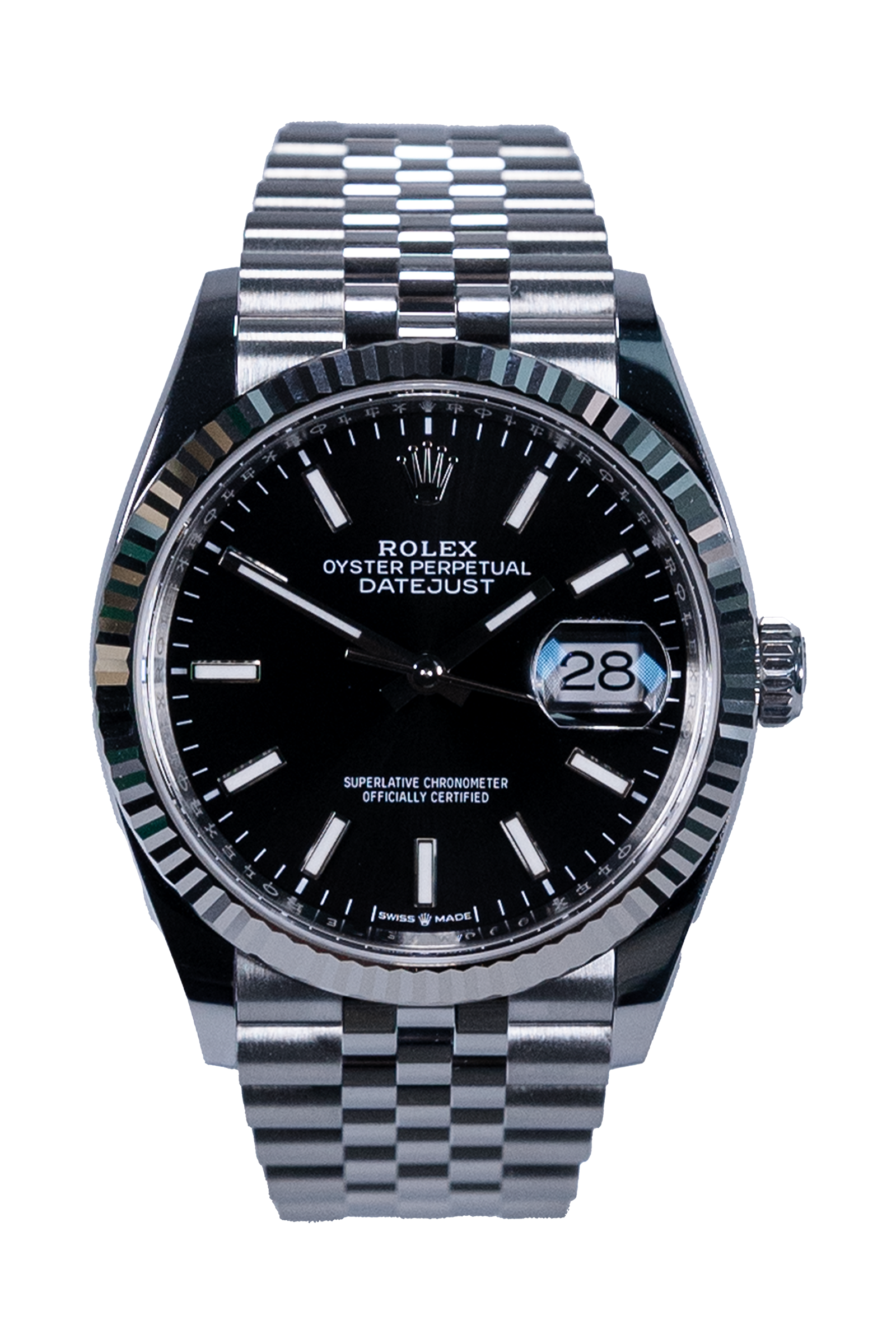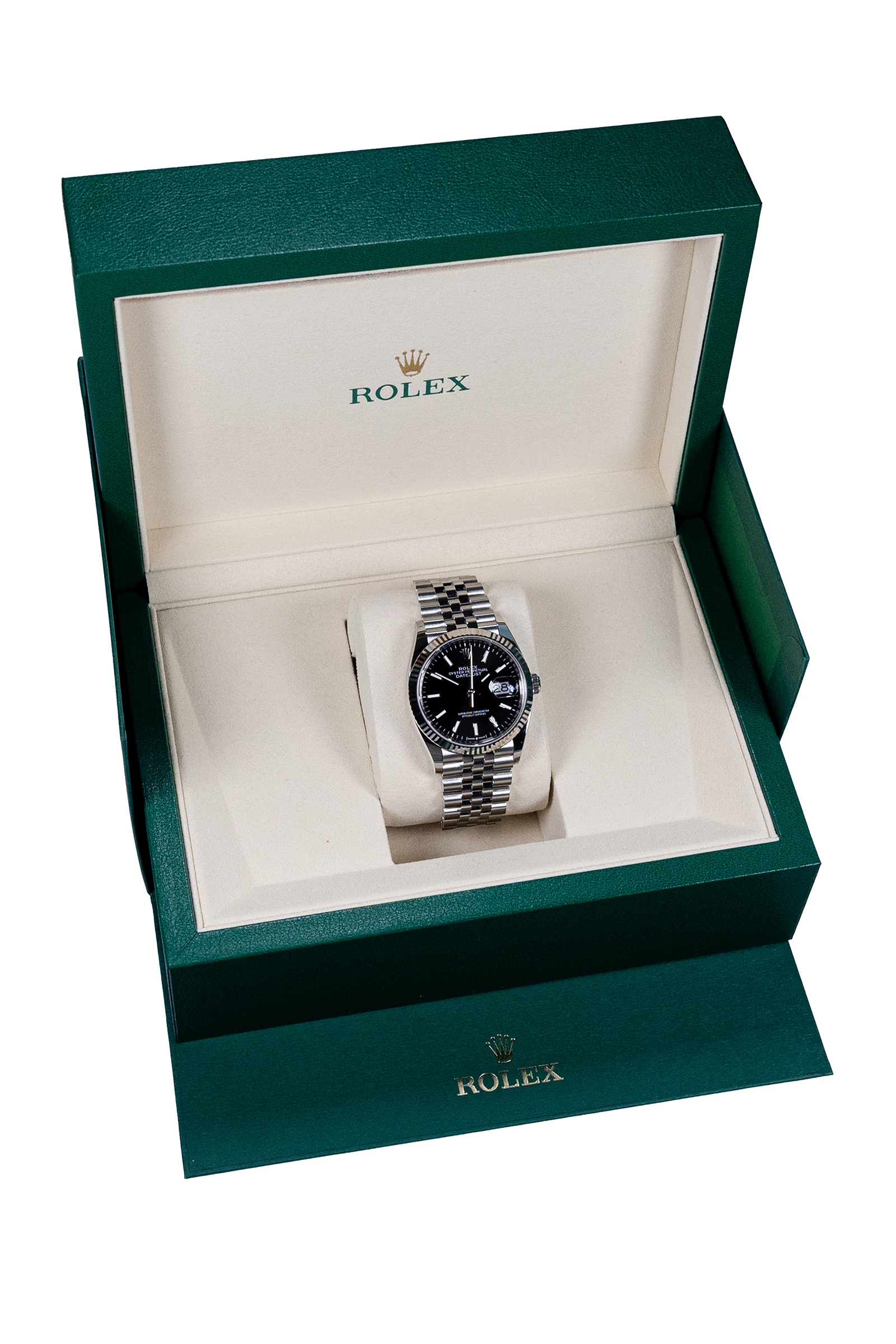 Diese Rolex Datejust 36 Ref. 126234 aus 2025 besticht durch ihr klassisches schwarzes Zifferblatt, die ikonische geriffelte Weißgold-Lünette und das elegante Jubilee-Band. Das 36-mm Edelstahlgehäuse sorgt für zeitlose Präsenz und hohen Tragekomfort. Die Uhr ist komplett ungetragen und wird im Fullset, inklusive Originalbox und Papieren, geliefert – eine perfekte Wahl für Liebhaber klassischer Rolex-Ästhetik.
