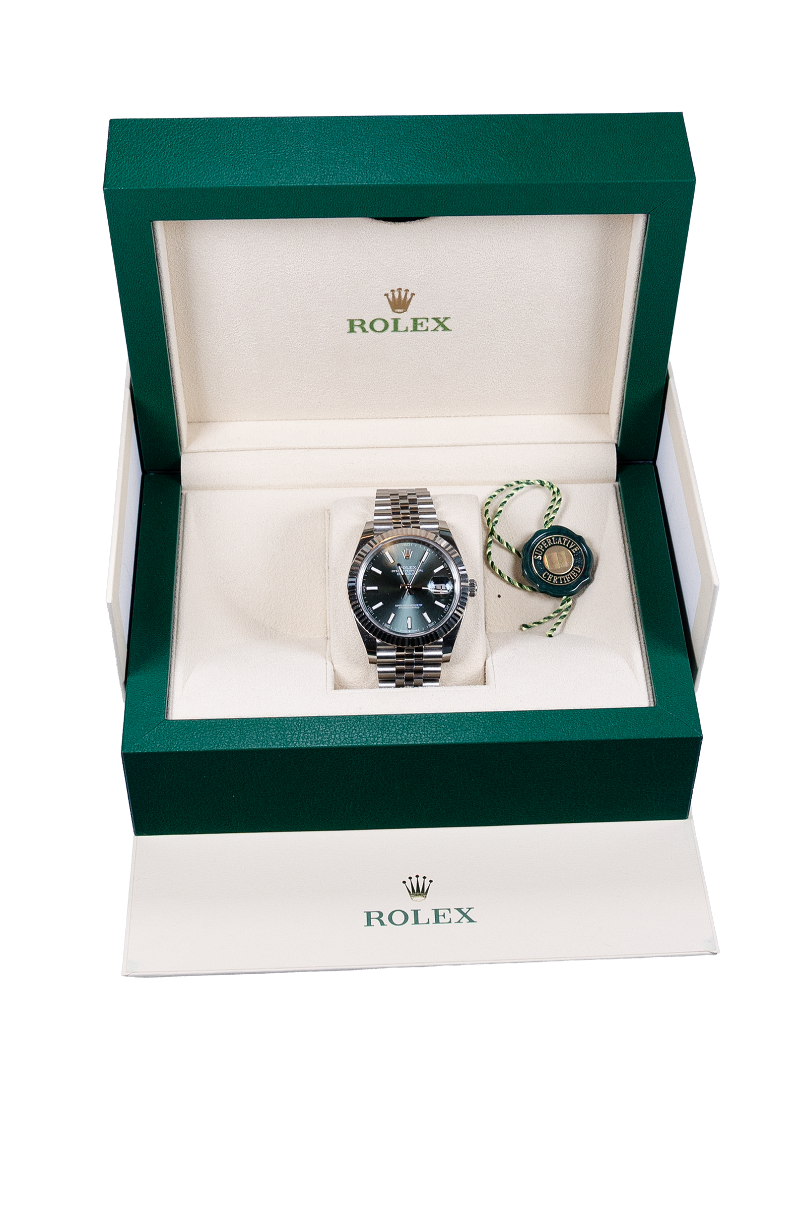 Diese Rolex Datejust 41 Ref. 126334 aus 2022 überzeugt mit dem begehrten grünen Zifferblatt, kombiniert mit der edlen geriffelten Weißgold-Lünette und dem eleganten Jubilee-Band. Das 41-mm Edelstahlgehäuse verleiht der Uhr eine moderne Präsenz, während das Design zeitlos bleibt. Die Uhr befindet sich in sehr gutem Zustand und wird im kompletten Fullset inklusive Box und Papieren geliefert. Selbstverständlich wurde sie von uns ausgiebig auf Echtheit geprüft, zusätzlich liegt ein von uns erstelltes Zertifikat bei.