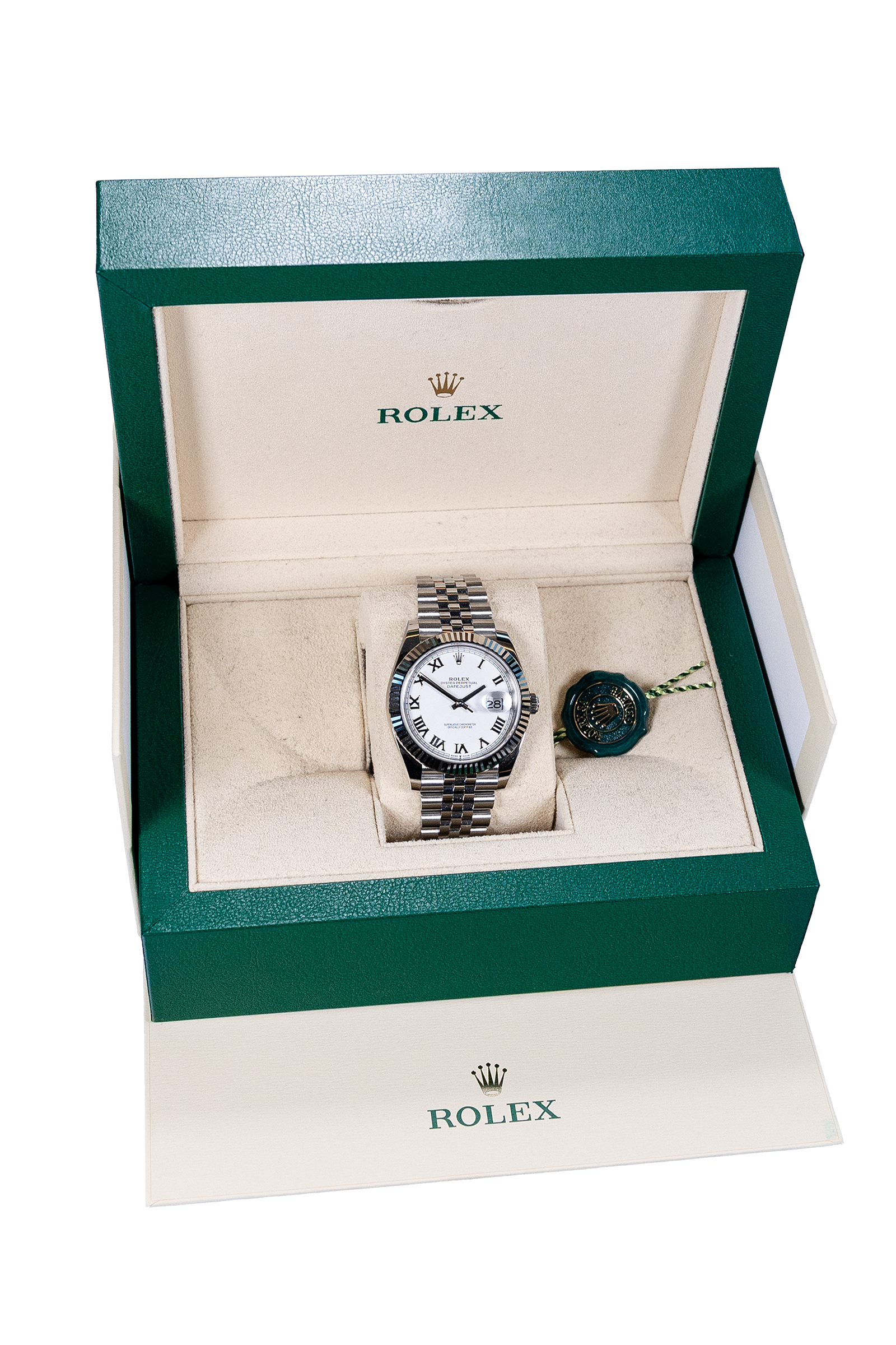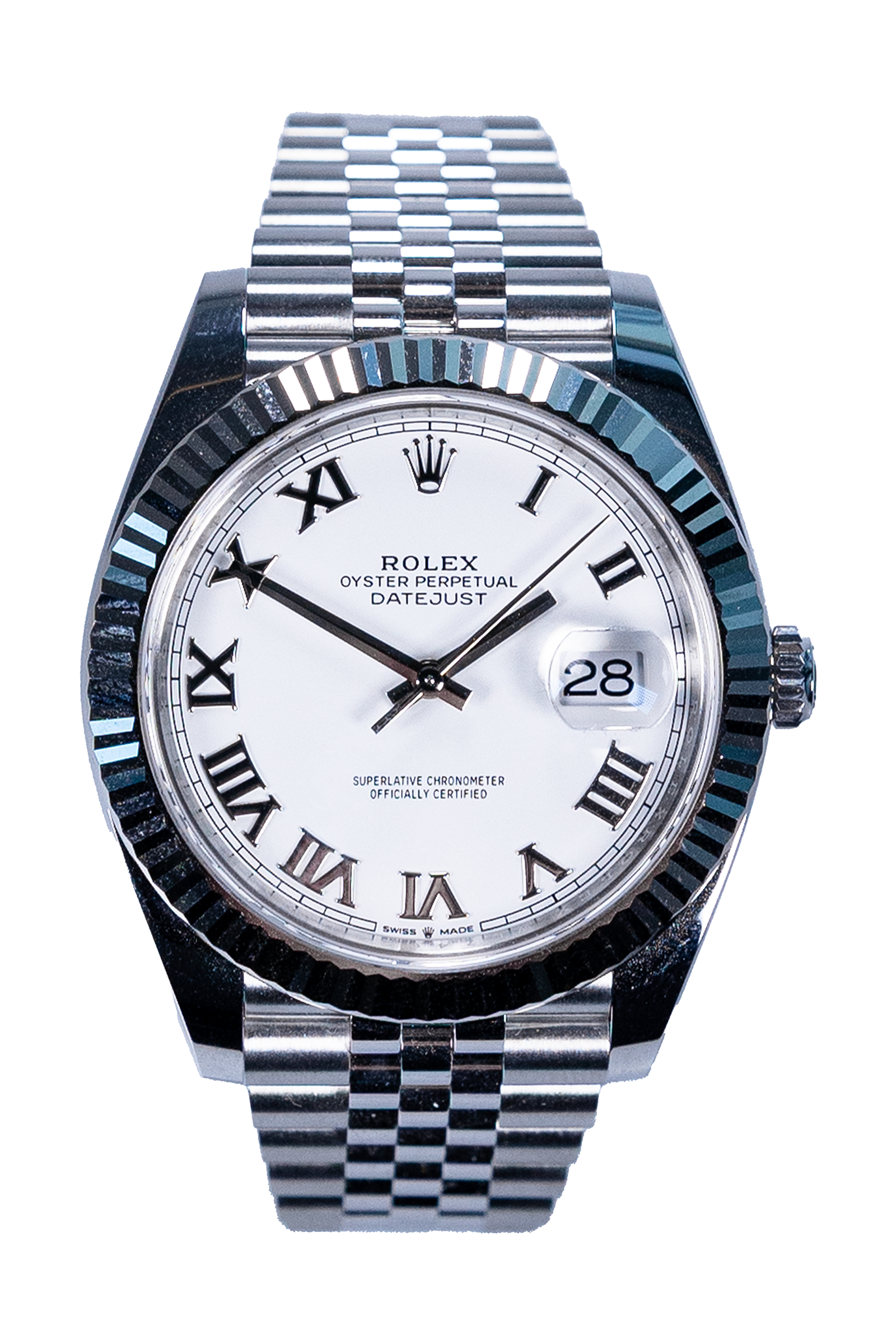 Diese Rolex Datejust 41 Ref. 126334 aus 2024 vereint klassische Eleganz mit markanter Präsenz. Das weiße Zifferblatt mit römischen Ziffern, die geriffelte Weißgold-Lünette und das stilvolle Jubilee-Band sorgen für einen zeitlosen, zugleich ausdrucksstarken Look. Das 41-mm Edelstahlgehäuse bietet moderne Proportionen bei hohem Tragekomfort. Die Uhr ist neu und ungetragen und wird im kompletten Fullset geliefert. Jede Uhr wird von uns ausgiebig auf Echtheit geprüft und mit einem zusätzlichen Zertifikat versehen.