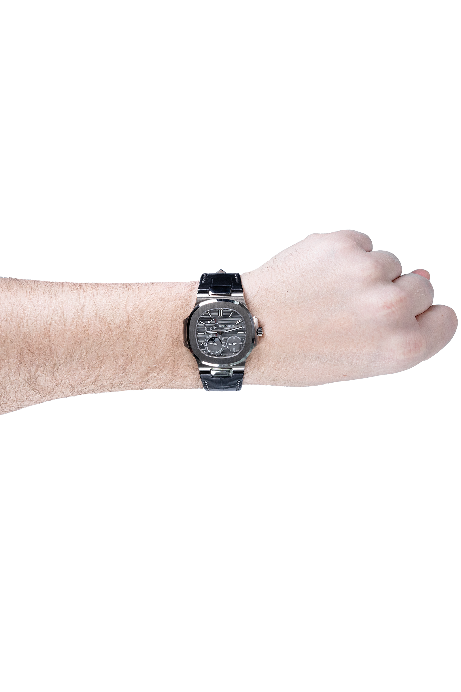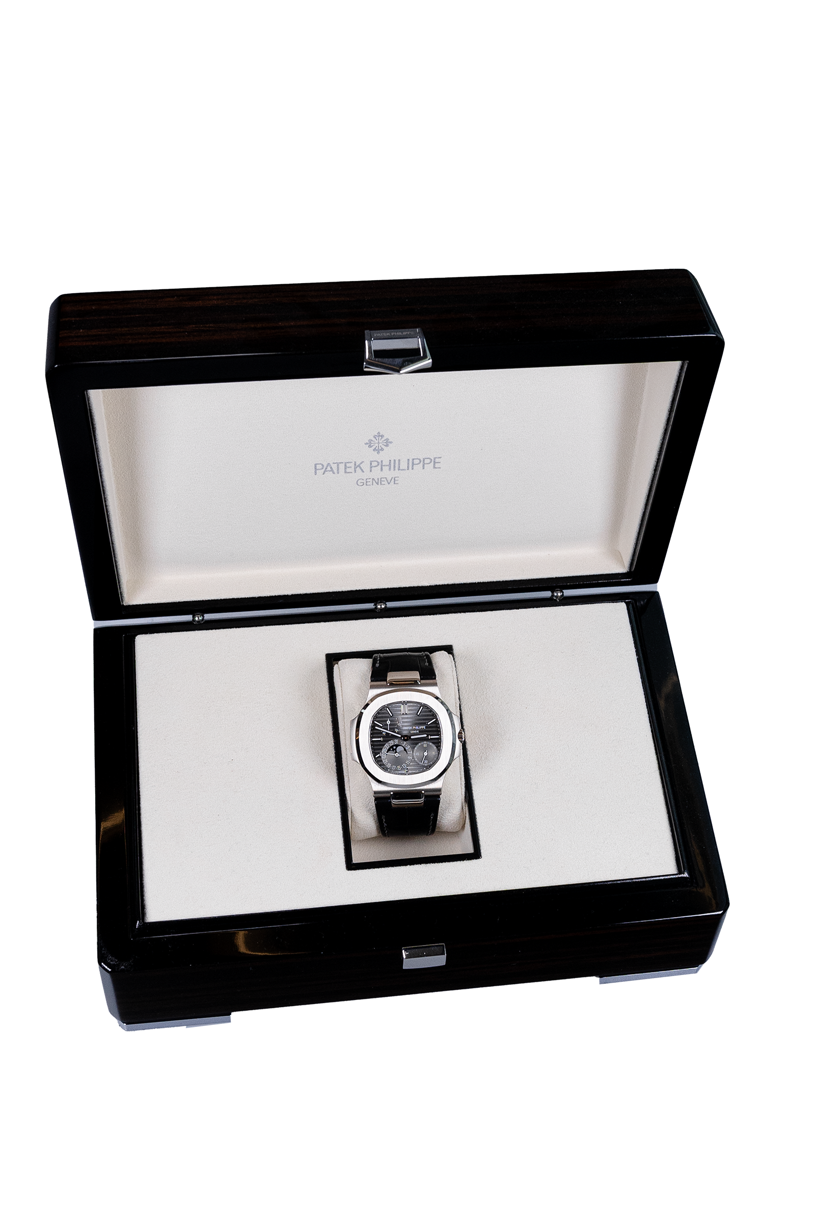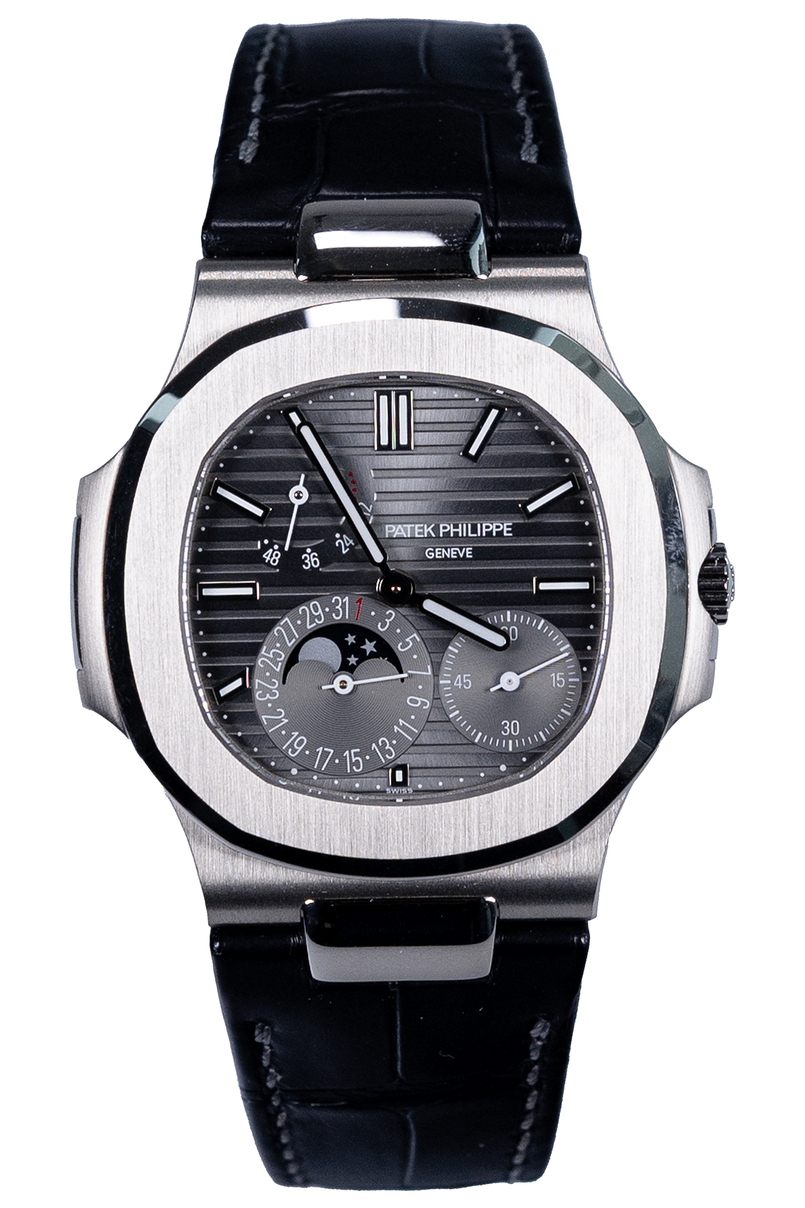 Diese Patek Philippe Nautilus 5712G-001 aus Weißgold zählt zu den begehrtesten und komplexesten Varianten der Nautilus-Linie. Das markante 40-mm Gehäuse, das elegante blau schimmernde Zifferblatt mit Mondphase, Gangreserveanzeige und dezentralem Datum, sowie das hochwertige Lederarmband verleihen ihr eine unverwechselbare Mischung aus Sportlichkeit und Haute Horlogerie.