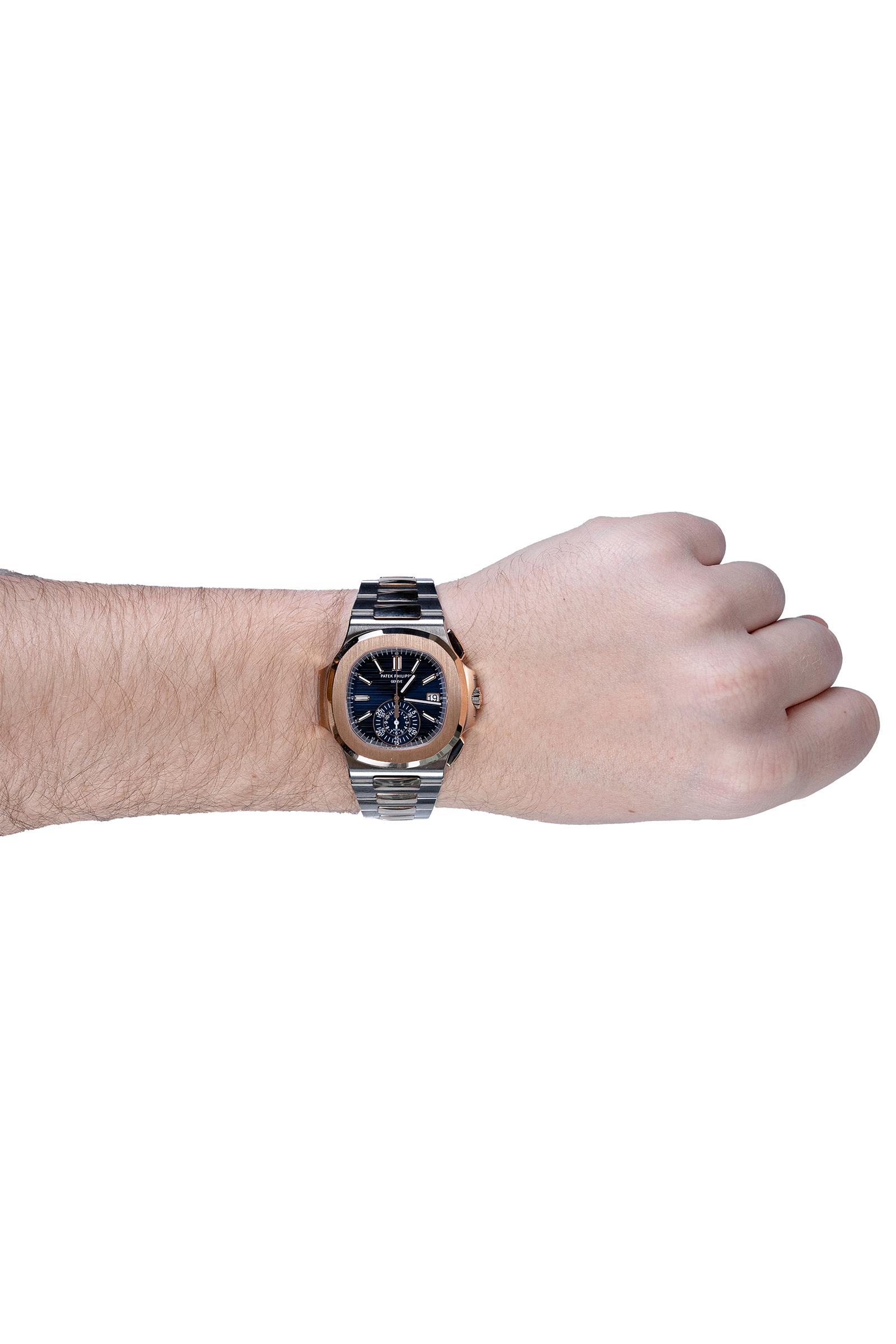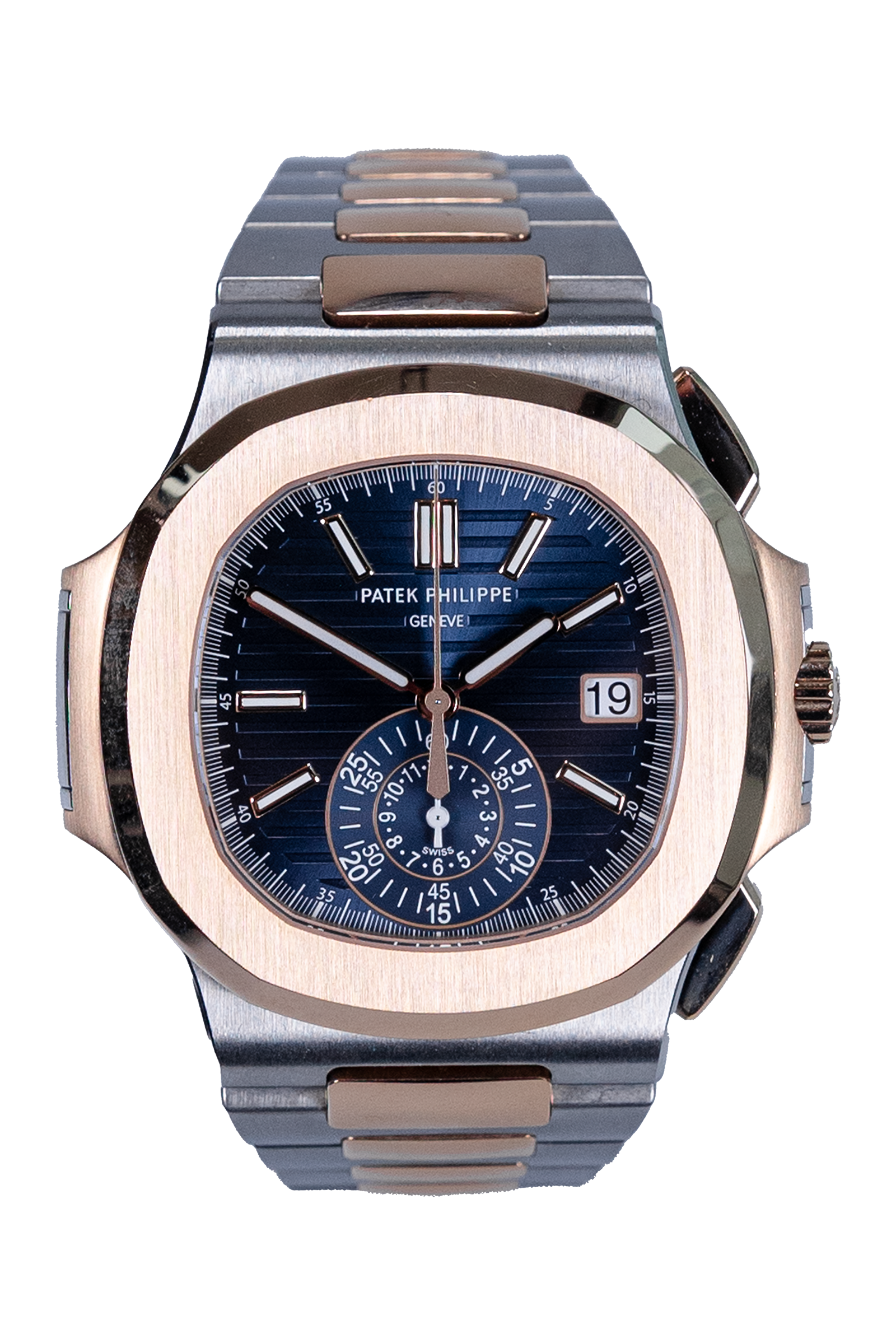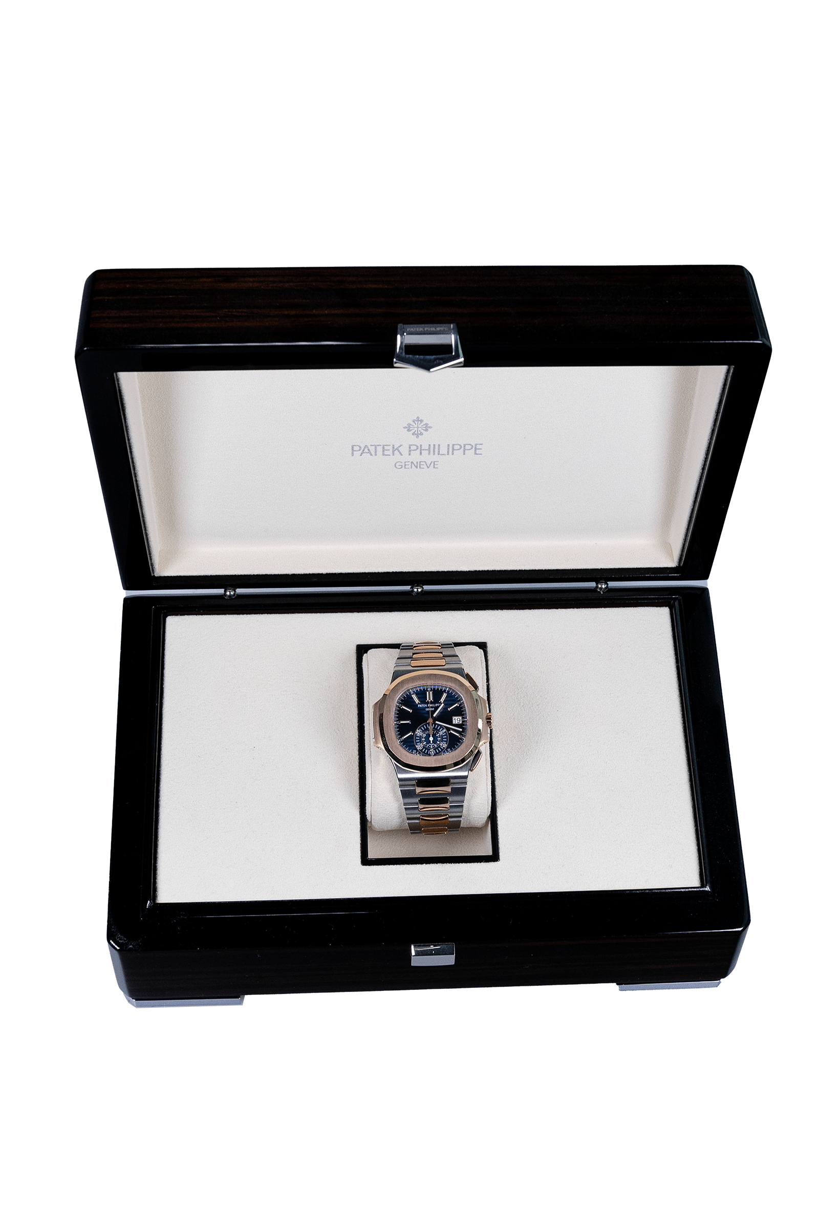 Diese Patek Philippe Nautilus 5980/1AR-001 aus 2023 vereint luxuriöse Materialien mit sportlicher Präsenz. Das markante 40,5-mm Gehäuse in Stahl und Roségold harmoniert perfekt mit dem blauen Zifferblatt und dem integrierten Bicolor-Armband. Der charakteristische Chronograph mit monopusherartiger Datumsanzeige macht dieses Modell zu einem echten Highlight der Nautilus-Linie. Die Uhr befindet sich in nahezu neuwertigem Zustand und wird im kompletten Fullset, inklusive Box und Papieren, geliefert – ein exklusives Sammlerstück mit beeindruckender Ausstrahlung.