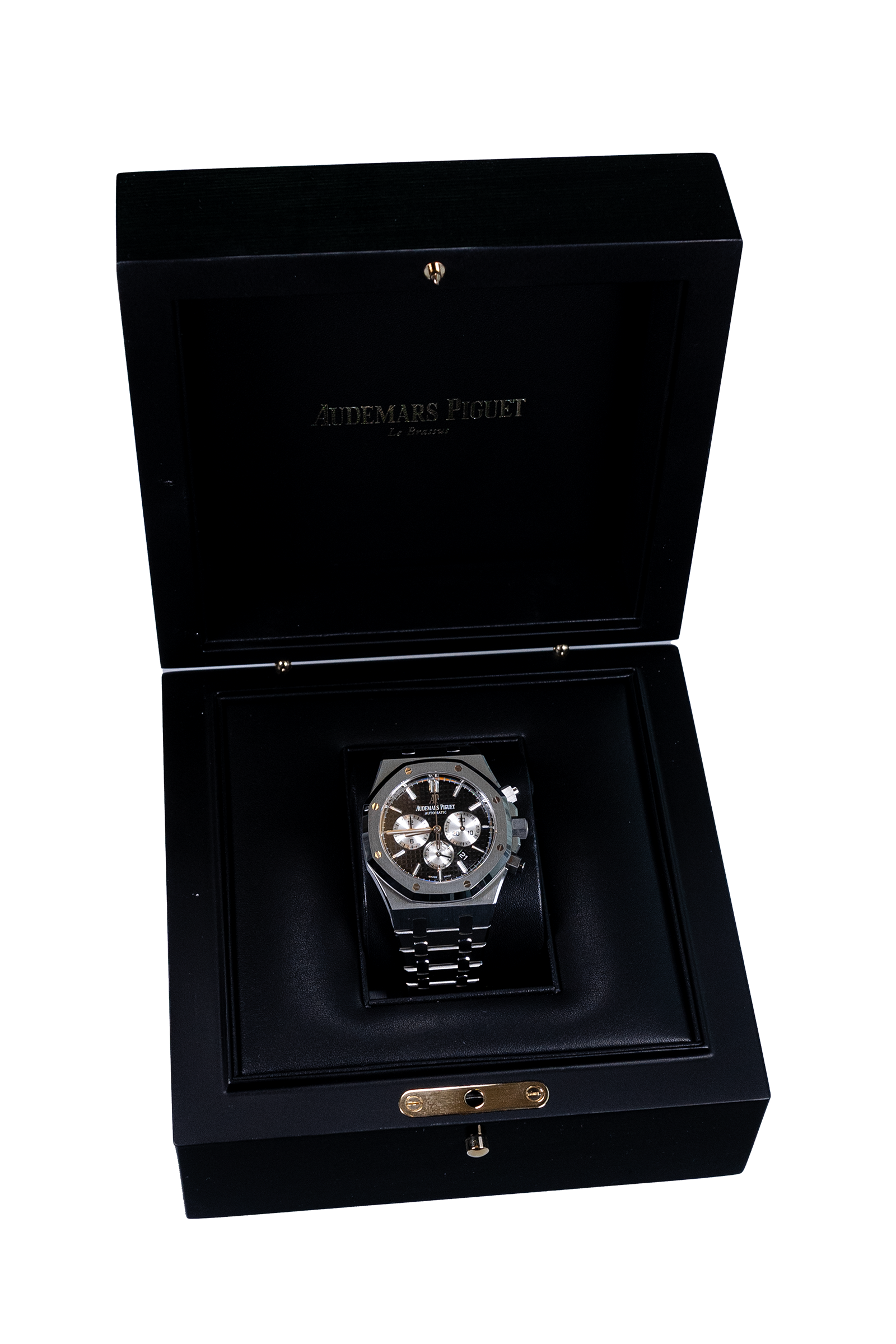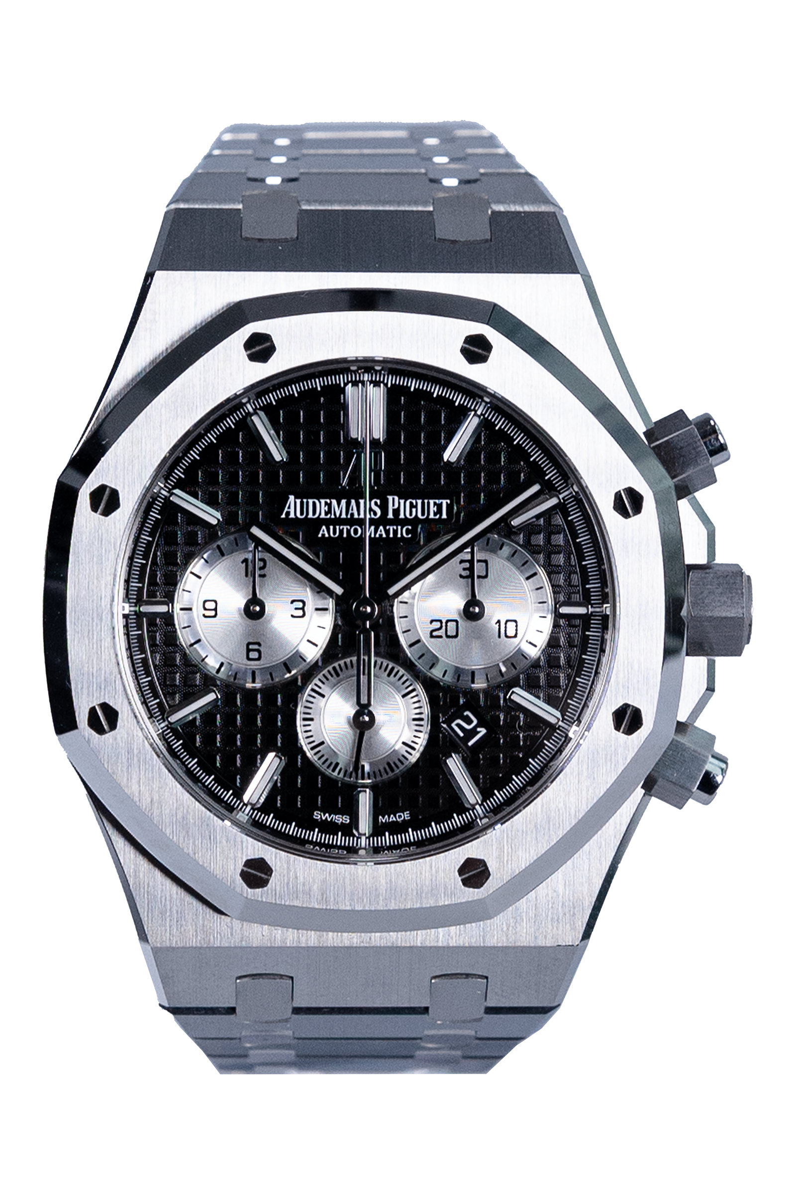 Diese Royal Oak Chronograph 26240ST aus 2020 präsentiert das ikonische Design von Audemars Piguet in seiner modernen Chronographen-Interpretation. Das 41-mm Edelstahlgehäuse, das integrierte Stahlband und das schwarze „Grande Tapisserie“-Zifferblatt verleihen ihr eine markante, sportlich-elegante Ausstrahlung. Ausgestattet mit dem neuesten AP-Chronographenwerk, ist dieses Modell technisch wie optisch ein Highlight der Royal Oak-Kollektion.