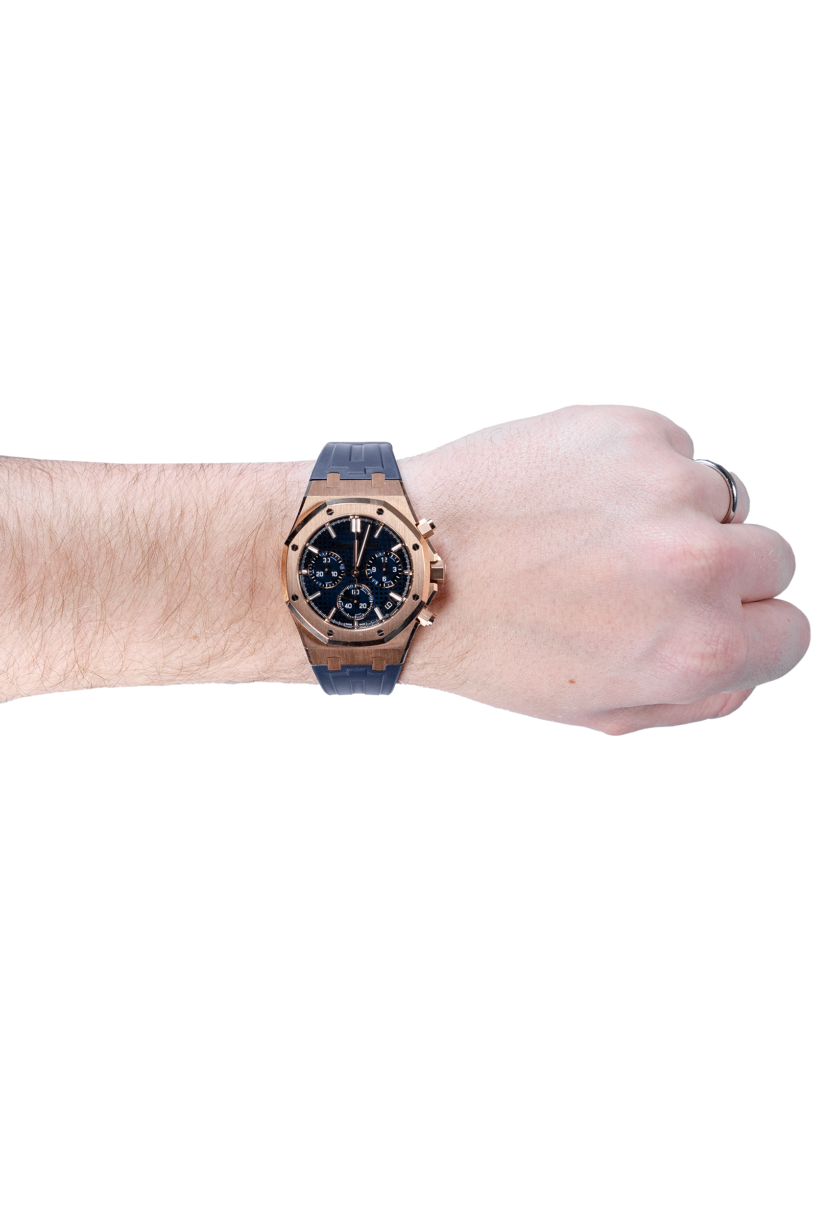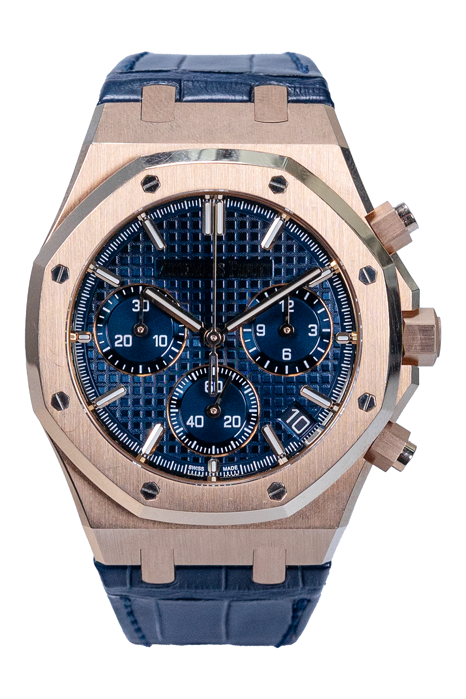 Dieser Audemars Piguet Royal Oak Chronograph aus 2022 gehört zur 50th Anniversary Edition der Royal Oak und vereint ikonisches Design mit luxuriösem Roségold und sportlicher Funktionalität. Das 41-mm Gehäuse wird durch ein spezielles Jubiläums-Zifferblatt mit verfeinerter „Grande Tapisserie“-Struktur ergänzt, das exklusiv für das 50-jährige Bestehen der Royal Oak entworfen wurde. Typisch für die Anniversary-Modelle sind zudem dezente Detailanpassungen sowie das automatische AP-Manufakturwerk der neuesten Generation, das höchste Präzision und moderne Architektur bietet. Das blaue Zifferblatt in Kombination mit dem Kautschukarmband sorgt für eine kraftvolle, zugleich elegante Ausstrahlung.