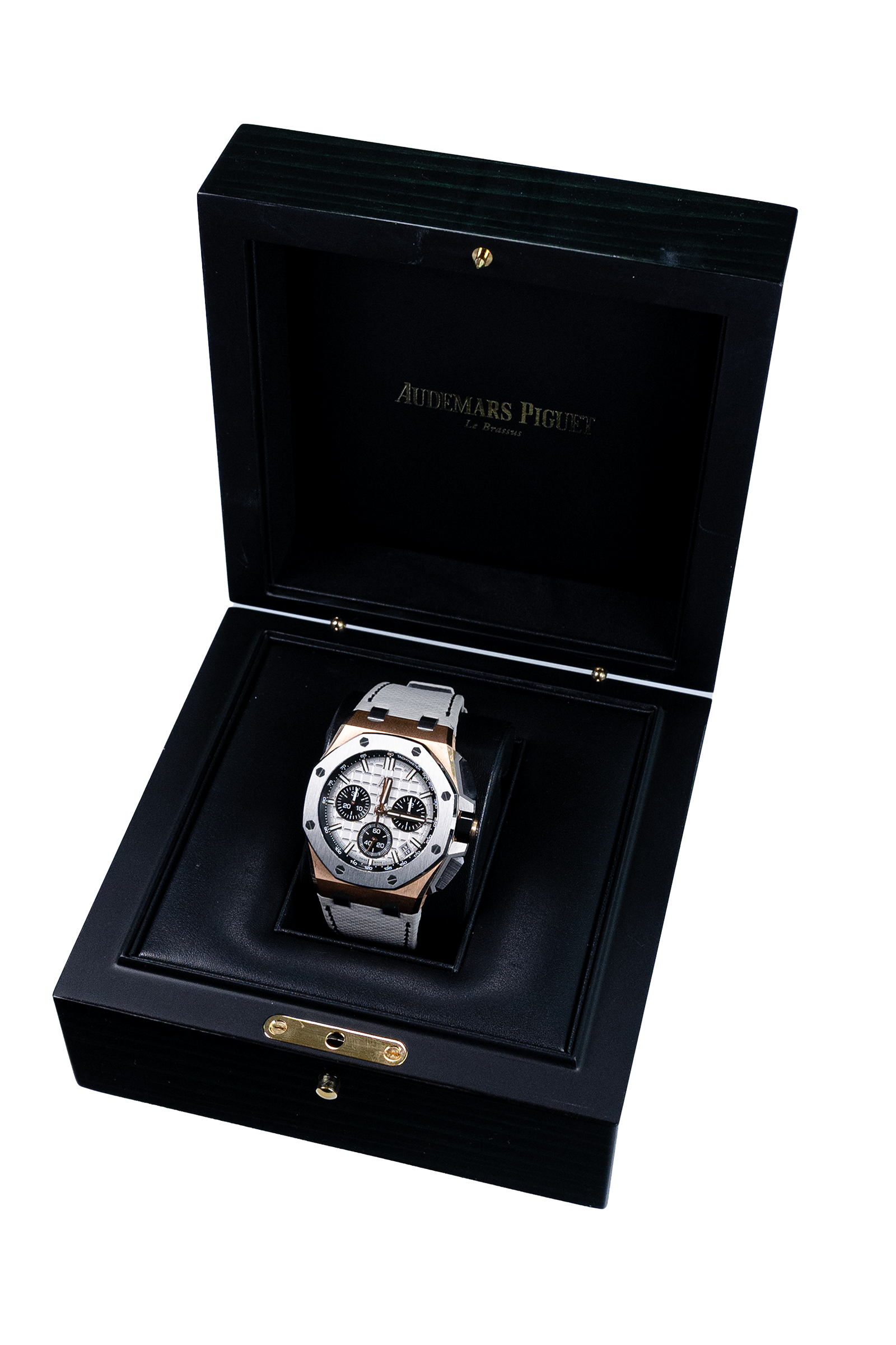 Dieser Royal Oak Offshore Offshore aus 2024 kombiniert ein imposantes 44 mm Gehäuse aus Titan und Roségold mit einem sportlichen grauen Kautschukband. Das kontrastreiche Zifferblatt im typischen „Méga Tapisserie“-Design unterstreicht den markanten Charakter dieser Uhr. Sie befindet sich in gutem Zustand mit leichten Gebrauchsspuren und wird im kompletten Fullset, inklusive Originalbox und Papieren, geliefert – sportlich, luxuriös und technisch beeindruckend.