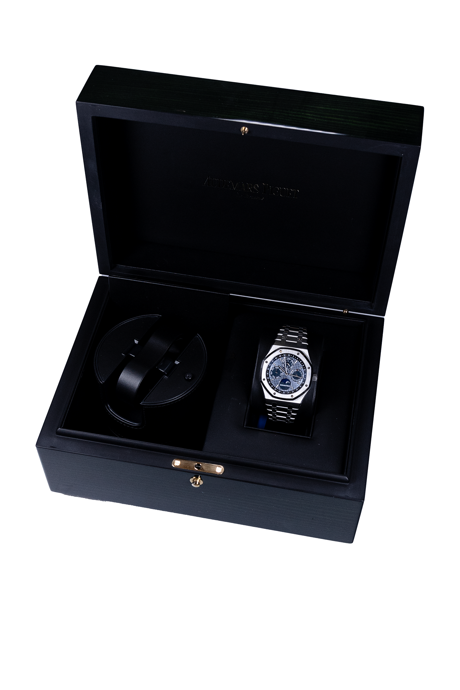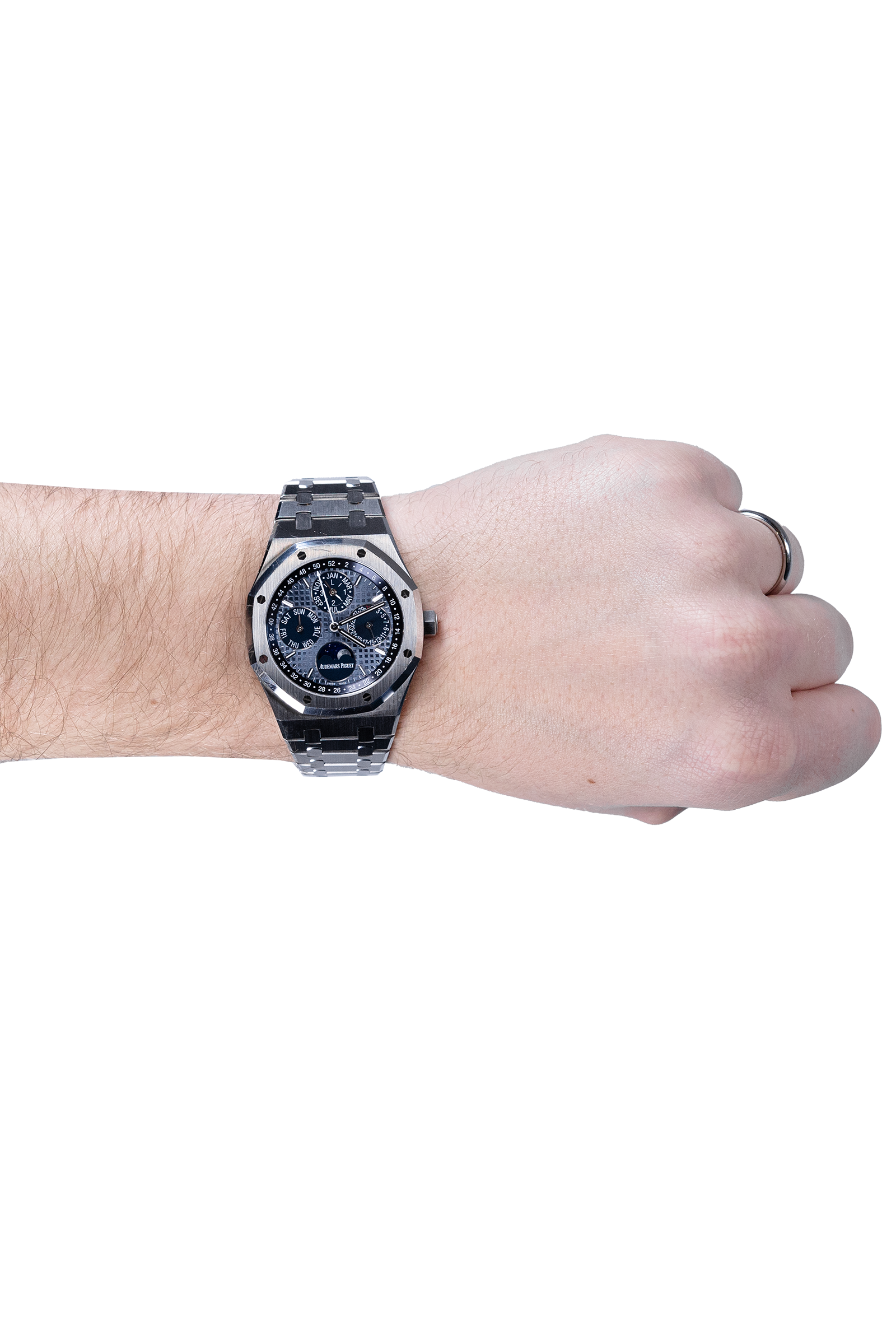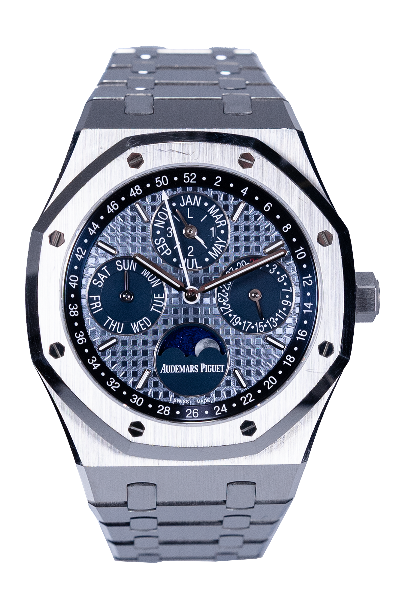 Diese Audemars Piguet Royal Oak Perpetual Calendar aus 2022 vereint ikonisches Design mit höchster Uhrmacherkunst. Das 41-mm Edelstahlgehäuse, das integrierte Stahlarmband und das elegante blaue Zifferblatt mit Ewigem Kalender machen dieses Modell zu einem der technisch anspruchsvollsten und begehrtesten Royal-Oak-Varianten. Die Uhr ist gebraucht, befindet sich in gutem Zustand und wird im kompletten Fullset inklusive Box und Papieren geliefert.