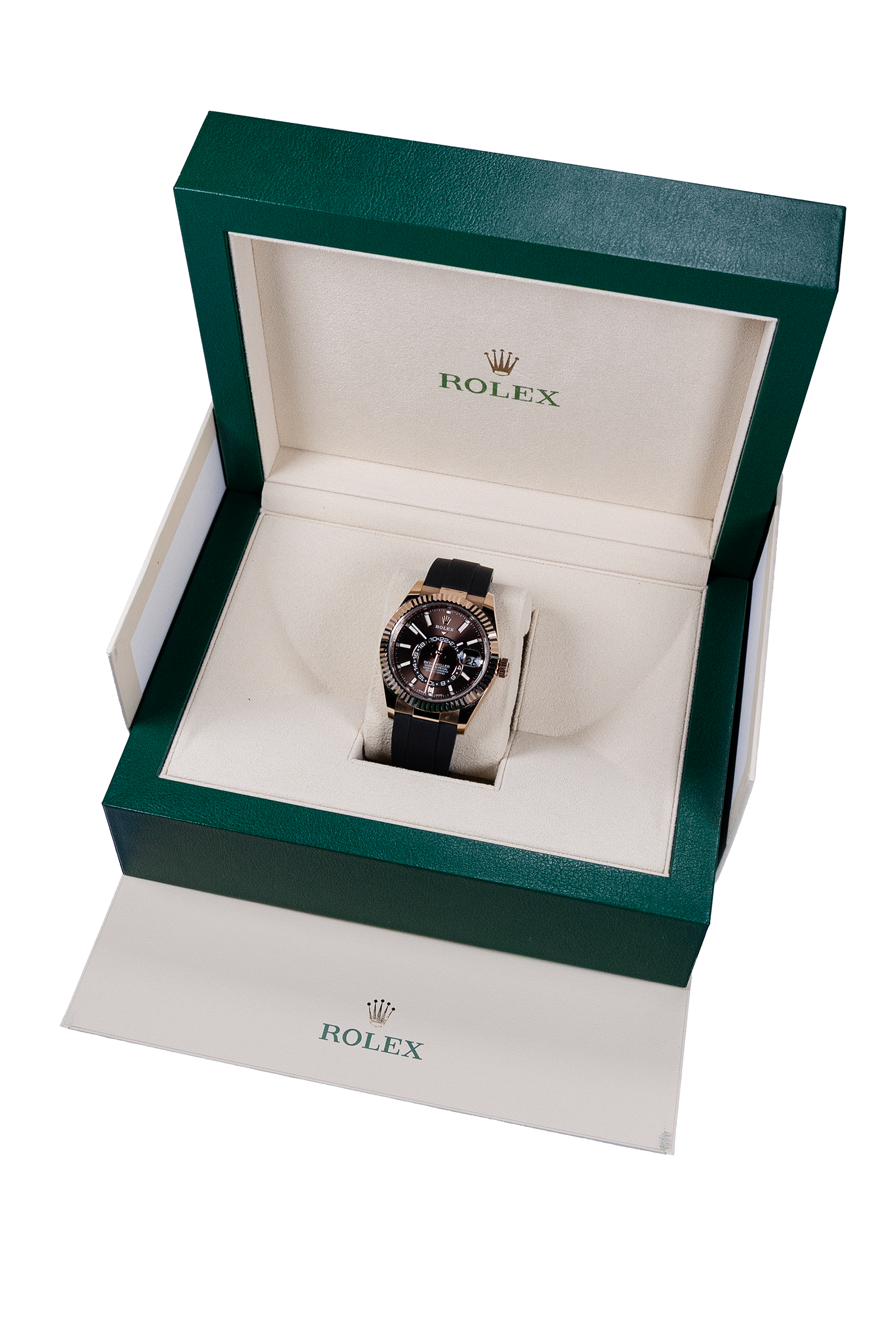 Diese Rolex Sky-Dweller Ref. 326235 aus 2022 vereint technische Raffinesse mit luxuriöser Ästhetik. Das Roségold-Gehäuse, das braune Zifferblatt und das elegante Oyster-Band verleihen der Uhr eine markante, warme Ausstrahlung. Als eine der komplexesten Rolex-Modelle bietet sie die Jahreskalender- und Dual-Time-Funktion – perfekt für Vielreisende. Die Uhr befindet sich in sehr gutem Zustand und wird im kompletten Fullset mit Box und Papieren geliefert.